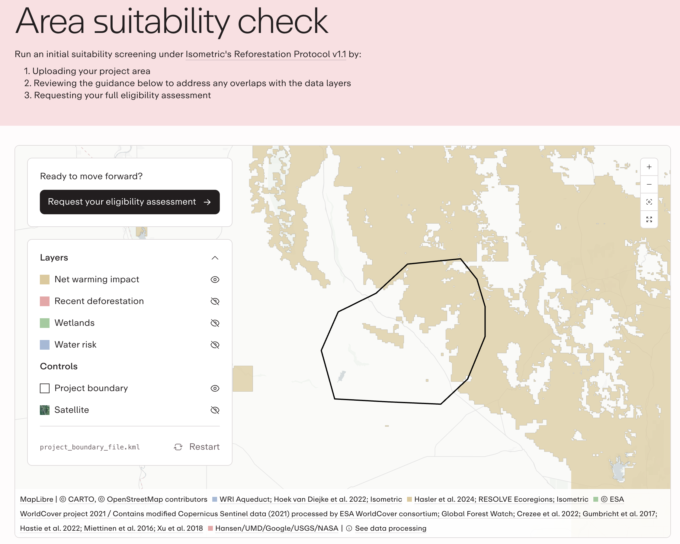 We’ve integrated this dataset into our Area Suitability Check tool so that project developers can simply upload their project boundary and immediately see if there are any areas within their project that are projected to have a net warming impact.